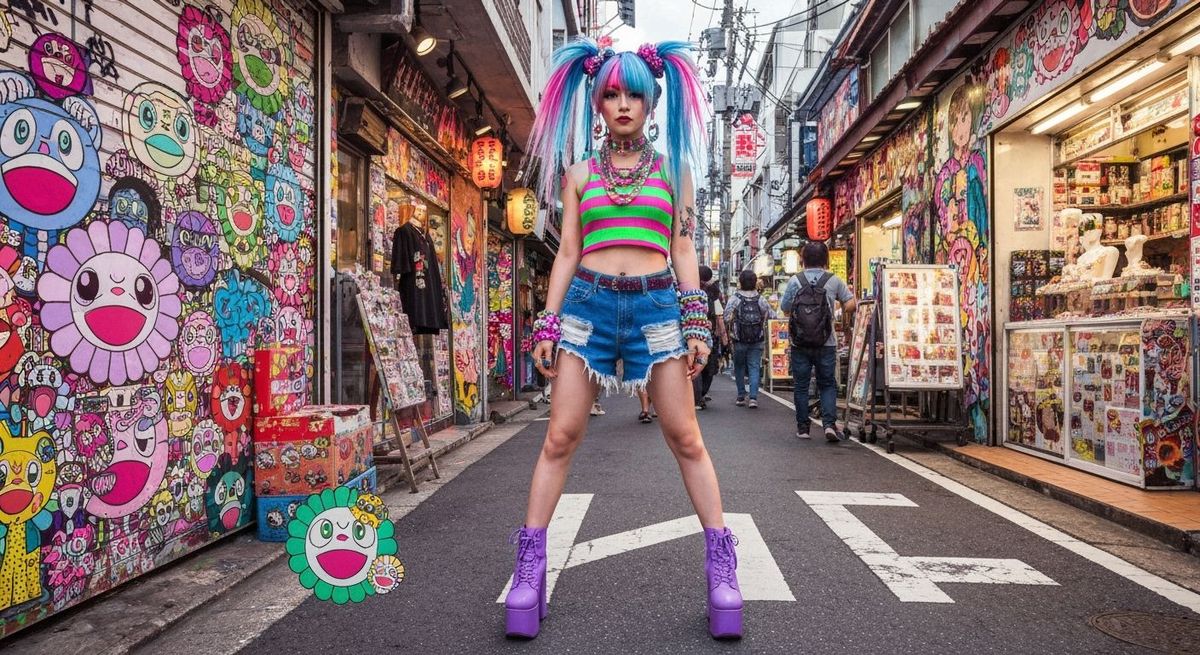 This image shows a gyaru girl in a vibrant Okinawa street. Her colorful outfit combines Shibuya and Harajuku styles, completed with bold accessories. The aesthetic mixes pop art and manga influences.