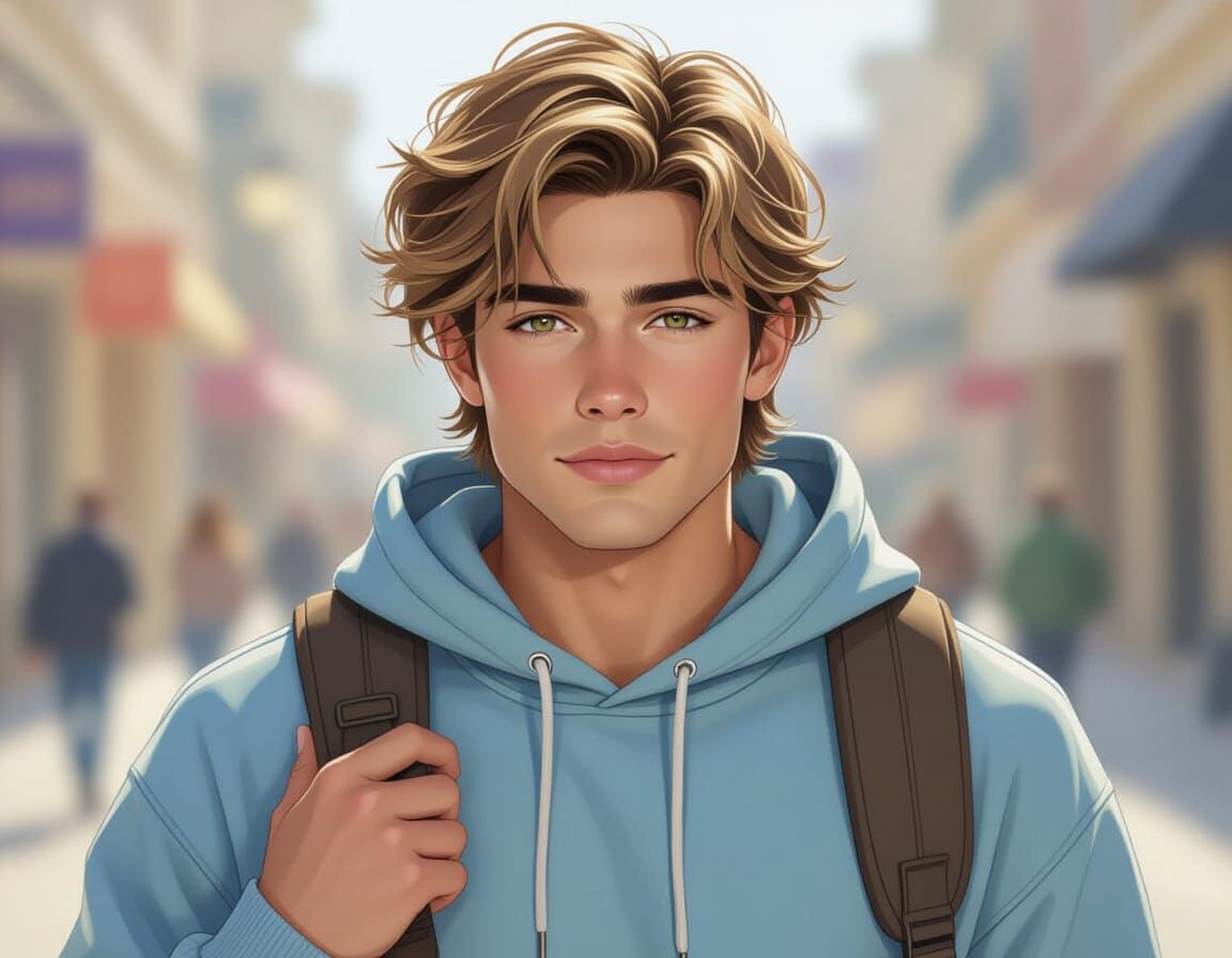A concept art portrait of a young man with sandy hair and hazel eyes, wearing a blue hoodie and cargo pants. Features dynamic lighting and intricate detail, presented as splash art.