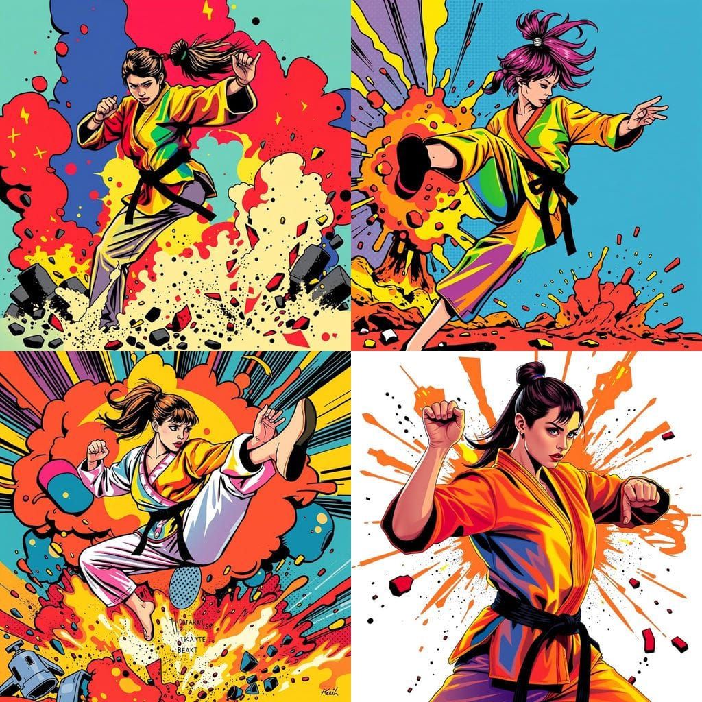 A dynamic image of a woman in a rainbow karate outfit with a black belt. The pop art style illustration shows an explosion behind her with fire and debris.