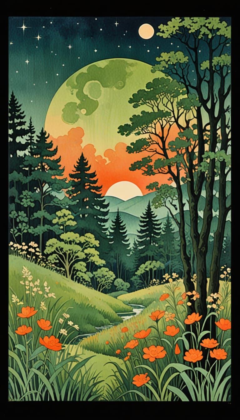 A serene landscape of a mystical forest clearing with a bright orange sky. This image showcases a folk art style reminiscent of 1920s art nouveau posters, using soft, dreamy colors.