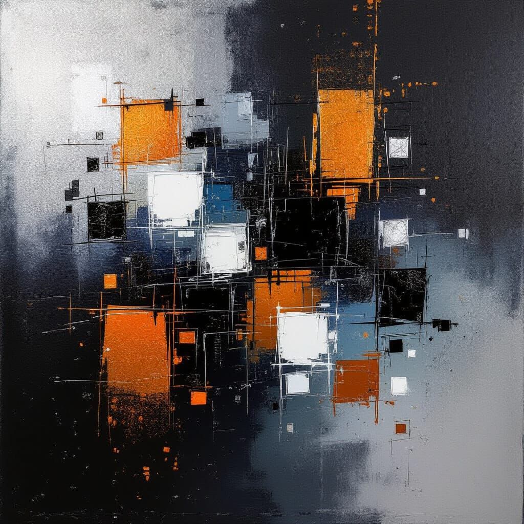 This abstract expressionist artwork features bold, dynamic brushstrokes in metallic silver, black, pearl orange, and pearl white. It evokes modern energy and sophisticated glamour with enhanced luminosity.