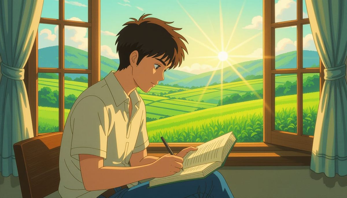 This anime key visual depicts a young Indian man, Arav, by a window with emerald valleys outside. Sunrise light illuminates him and his notebook, rendered in a detailed, luminous, and cinematic style.