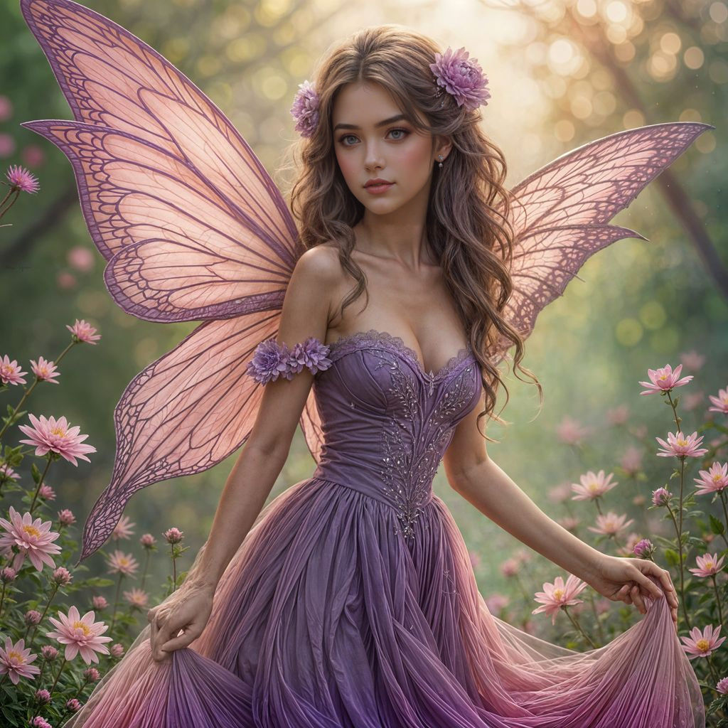 This image shows a delicate, life-like faerie queen with a shy expression, surrounded by soft, blurry blooms in pastel hues of dusky purple and pink. Her floaty wings add to her ethereal beauty.