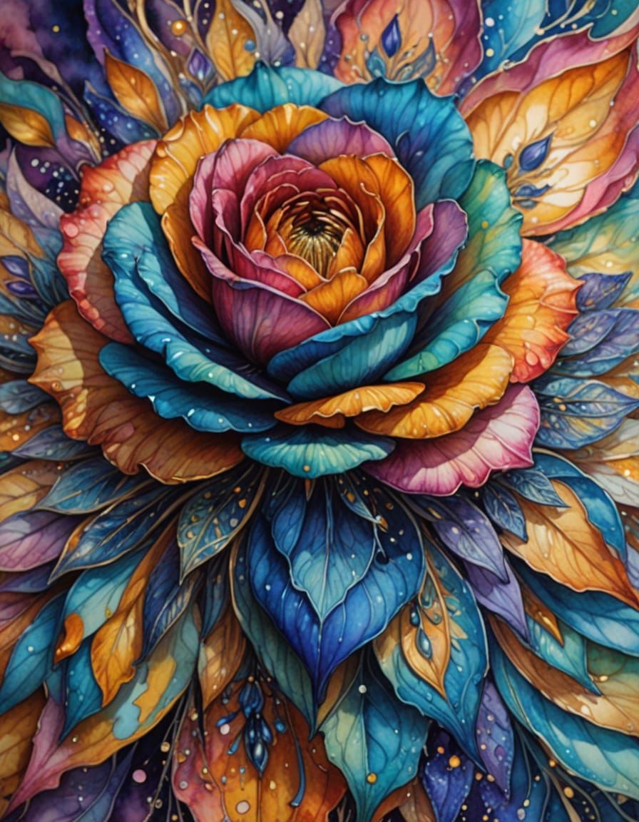 This image shows a delicate, magical flower in close-up, its soft petals and shimmering center set against a warm, ethereal background. The fine art style combines vibrant watercolor and ink for a dreamy, 3D-realistic effect.