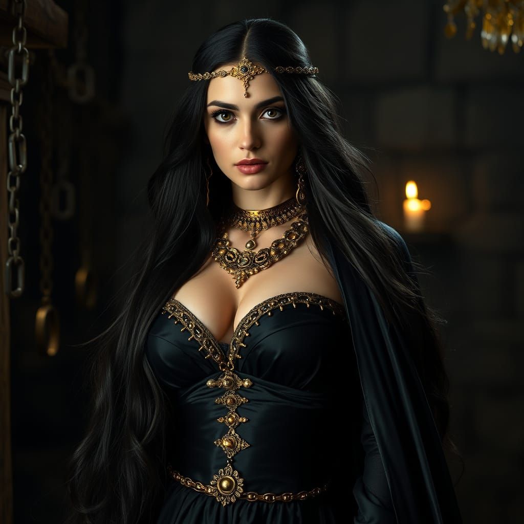A powerful goddess with black hair and golden jewelry stands serenely in a medieval dungeon. Cinematic film still with dramatic lighting and a pre-Raphaelite influence.
