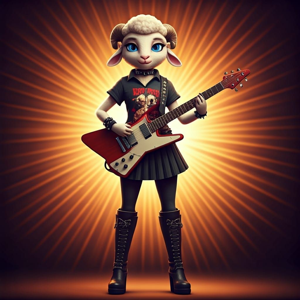 A striking picture of a teenage sheep character holding an electric guitar. The character is wearing rock and roll attire against a bright gradient background with cinematic lighting in a 3D digital art style.