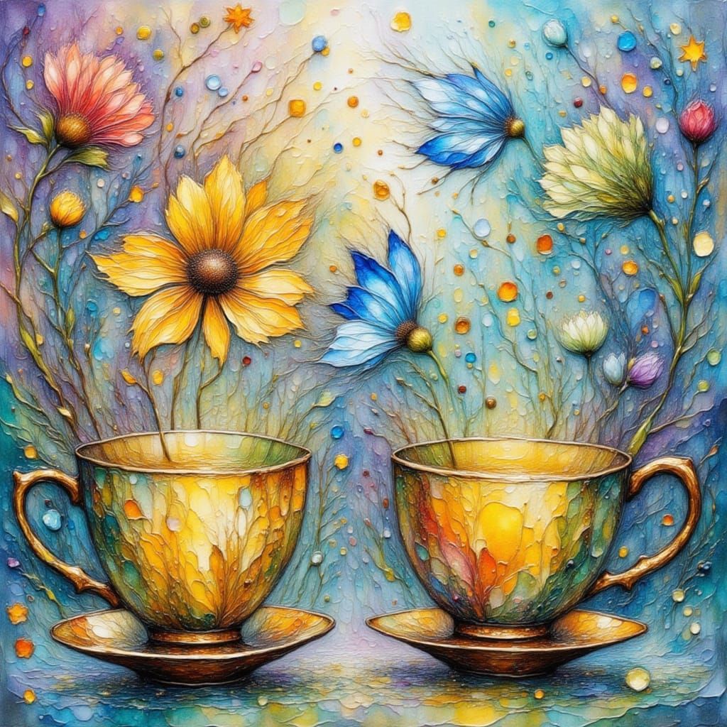 This image shows two tea cups filled with sunshine, stars, and shimmer, creating a magical and whimsical scene. The artwork has a cute and dreamy aesthetic.