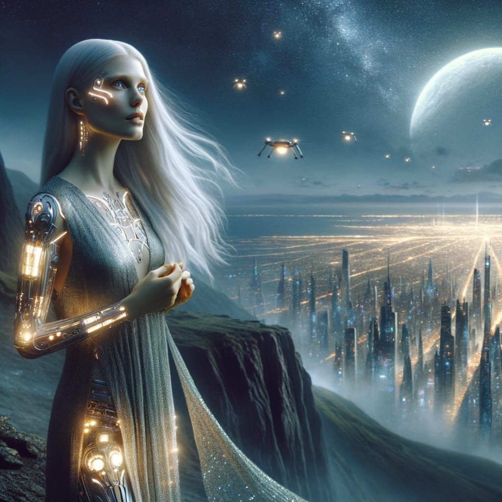 This image shows a futuristic woman standing on a cliff overlooking a cyberpunk city. She is of Slavic descent with white hair and blue eyes, enhanced with biomechanical implants. The sky is filled with stars and a shattered moon.
