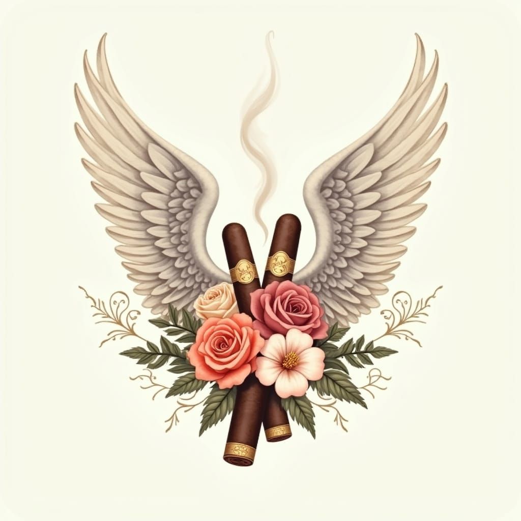 This image showcases a stylized, gray-scale logo featuring angel wings, intricate feathers, and colorful flowers, with cigars in a luxurious, vintage style, set against a creamy background, blending classic and modern aesthetics.