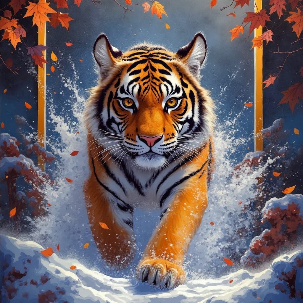 A photorealistic tiger bursts out of a National Geographic Magazine cover, charging through heavy snow with big, expressive eyes. The artwork combines styles of Thomas Kinkade, Alberto Seveso, Carne Griffiths, and Conrad in a stunning oil painting with an Australian theme.