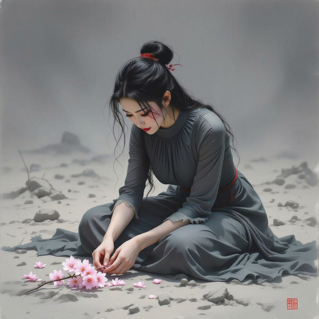 This image shows a forlorn princess sitting on desolate land, clutching a luminous flower. The artwork features a muted grayscale palette with a soft watercolor texture, evoking a somber and desolate atmosphere.