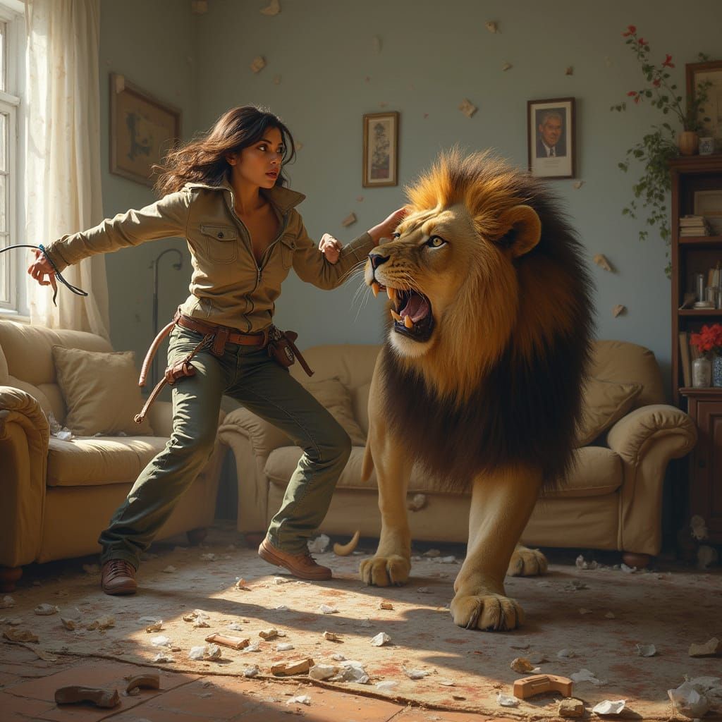 A dramatic image of a lion attacking his owner in a living room. The scene features vivid colors, intense brushstrokes and chaotic details. The artwork is reminiscent of dramatic artistic styles.
