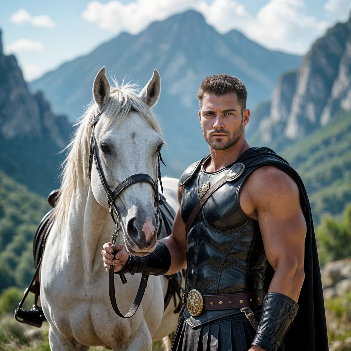 This image shows a muscular warrior in black leather armor standing by a pale horse in a grassy caldera. The scene evokes ancient Greece, with a cinematic film aesthetic and warm color grading.