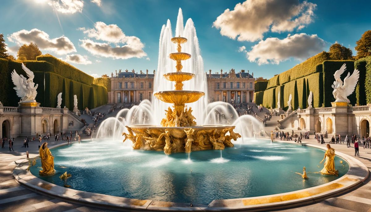 Hyperrealistic rendering of the Latona Fountain in the Gardens of Versailles under a clear blue sky, with ultra-detailed golden statues gleaming in the sunlight, crystal-clear water jets frozen mid-air with realistic light reflections, intricately carved marble details, lush manicured hedges in the background, ...