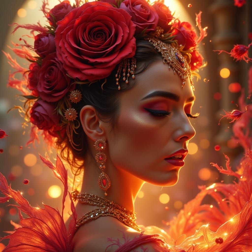 A captivating head and shoulders portrait of a woman adorned with roses. The image, reminiscent of trending splash art, features dynamic lighting and triadic colors, with a hyperrealistic, high-gloss aesthetic.