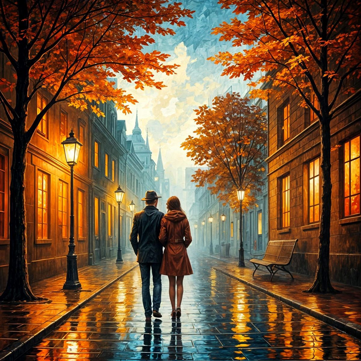 A vibrant oil painting of a couple walking in a mystical autumn city. Golden light reflects on the wet streets and illuminates the orange and yellow leaves.