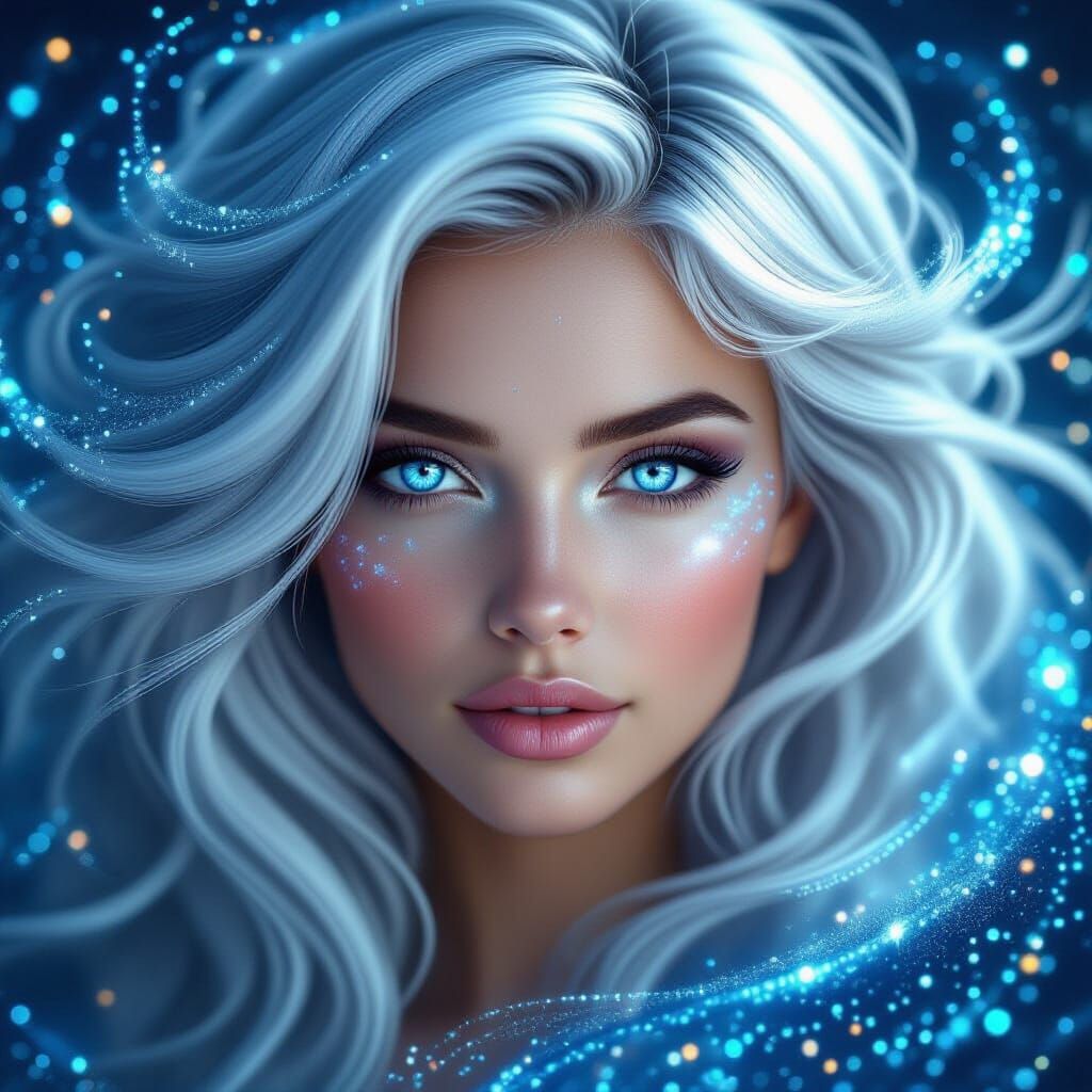 This image shows a beautiful woman with piercing blue eyes and white hair that seems to be made of stardust. The hair spirals and shimmers with fractal patterns as 3D rendered digital art.