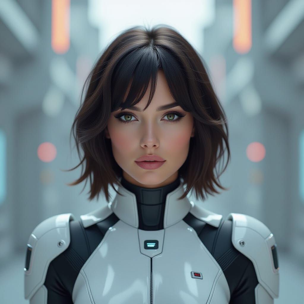 This image shows a woman with dark brown, middle-parted curtain bob hair in a cyberpunk aesthetic. The image features a sleek, high-tech aesthetic and muted color palette.