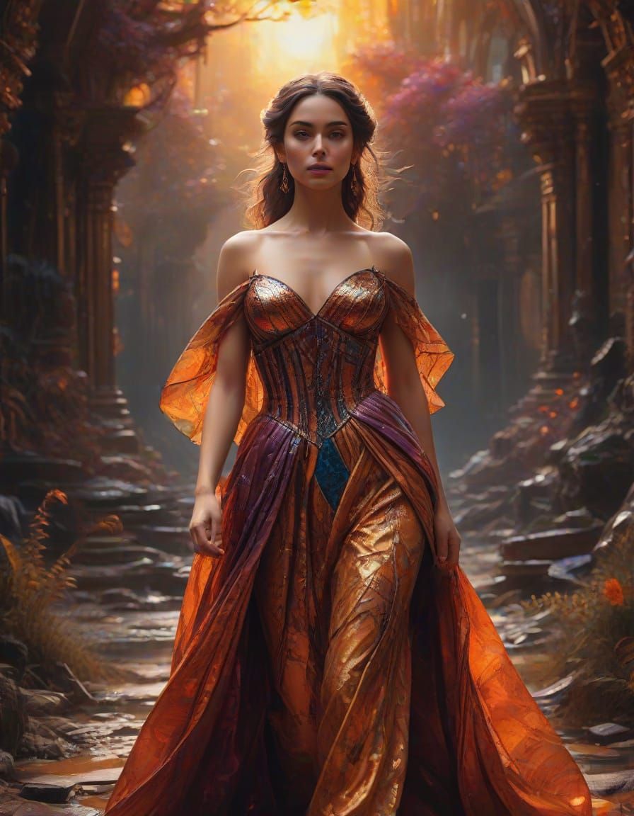 This image depicts a goddess in a surreal landscape, rendered with thick, textured oil paint and bold brushstrokes. It features a kaleidoscope gown and glowing makeup in amber and amethyst tones.