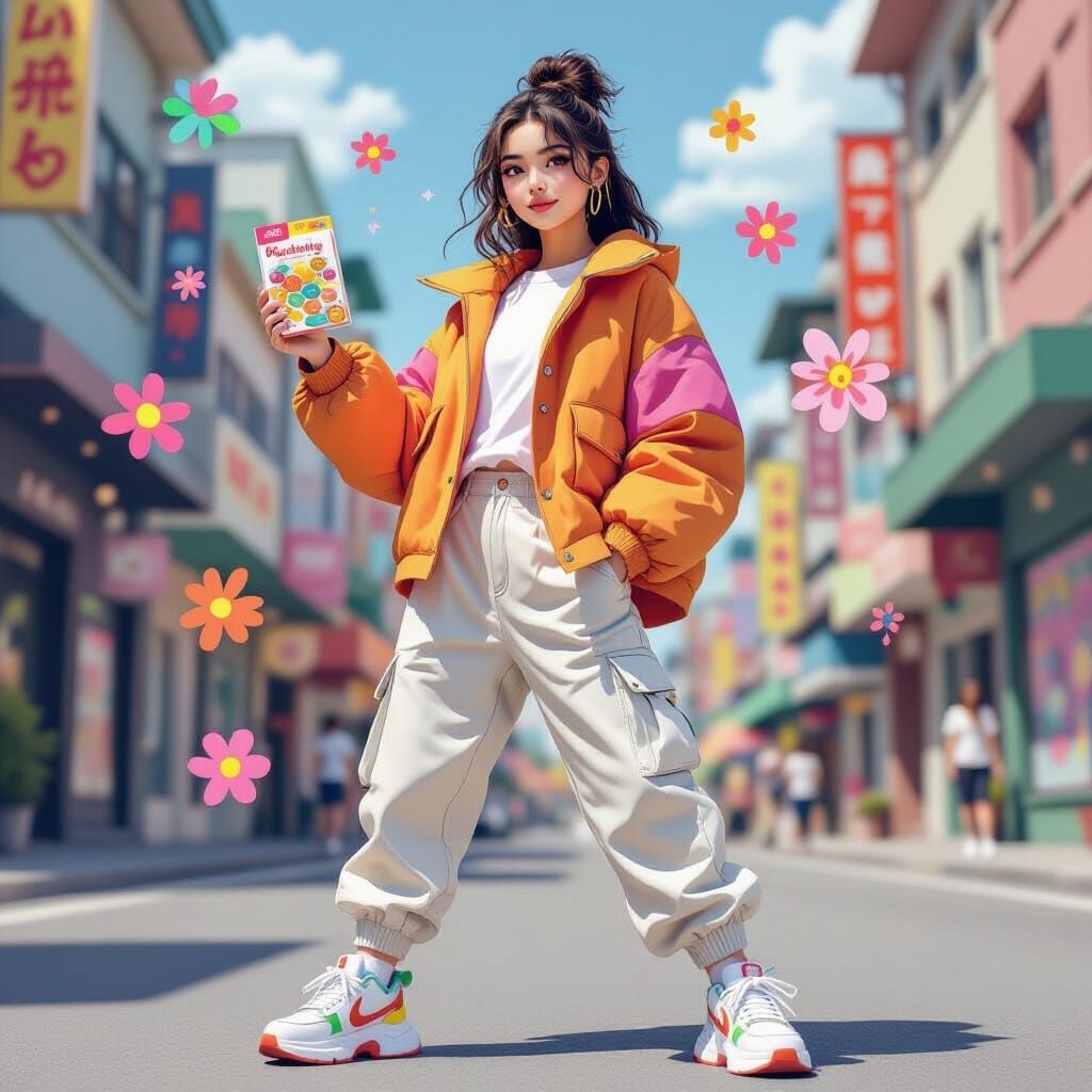 A modern teenage girl with a confident attitude offers a candy package to the camera, set against a lively street with cartoonish overlays in a realistic style.