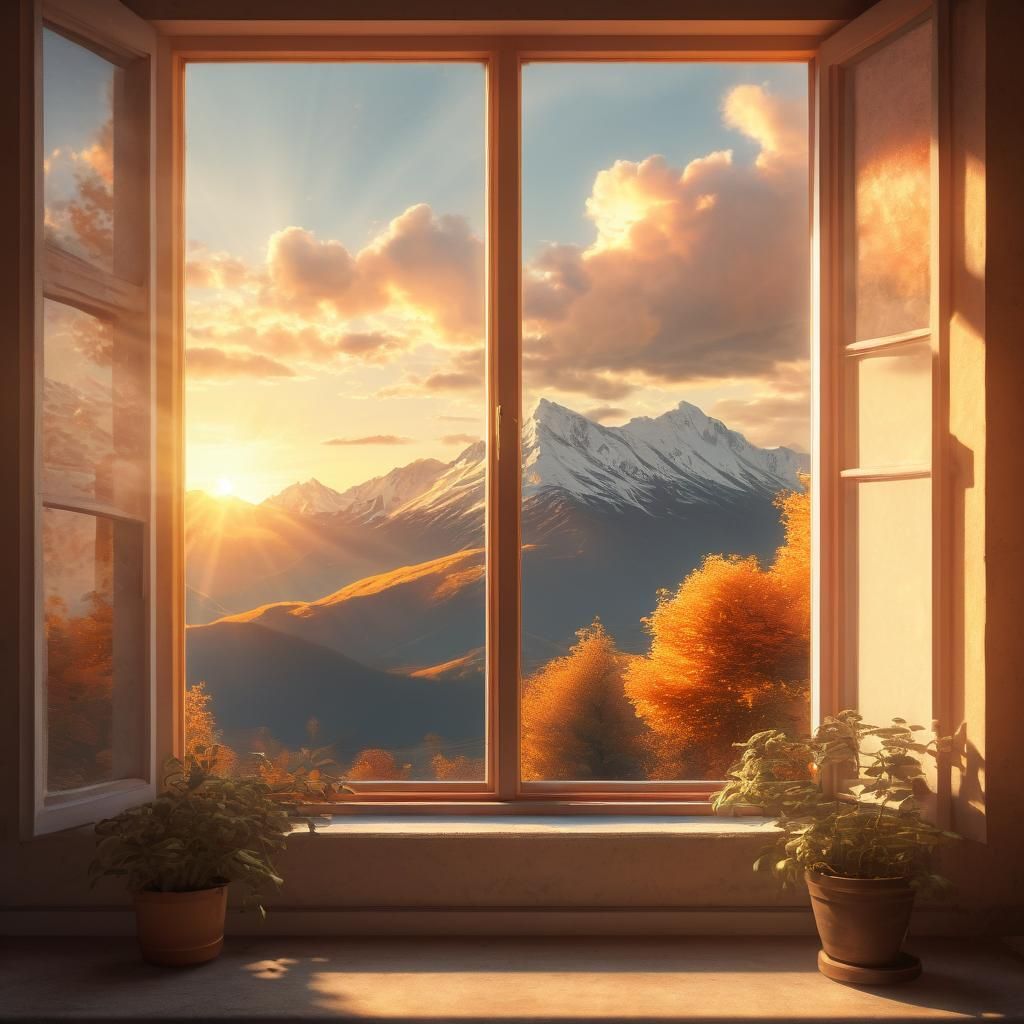 A breathtaking digital painting of a sunrise viewed through a window. The warm color palette and soft focus create a heavenly, atmospheric vista with intricate details and a cinematic feel.