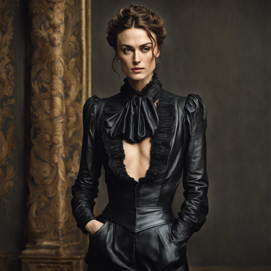 This image shows Keira Knightley as a French Revolution spy. She is wearing a low-cut white blouse and black leather pants, in a sensual, baroque style.