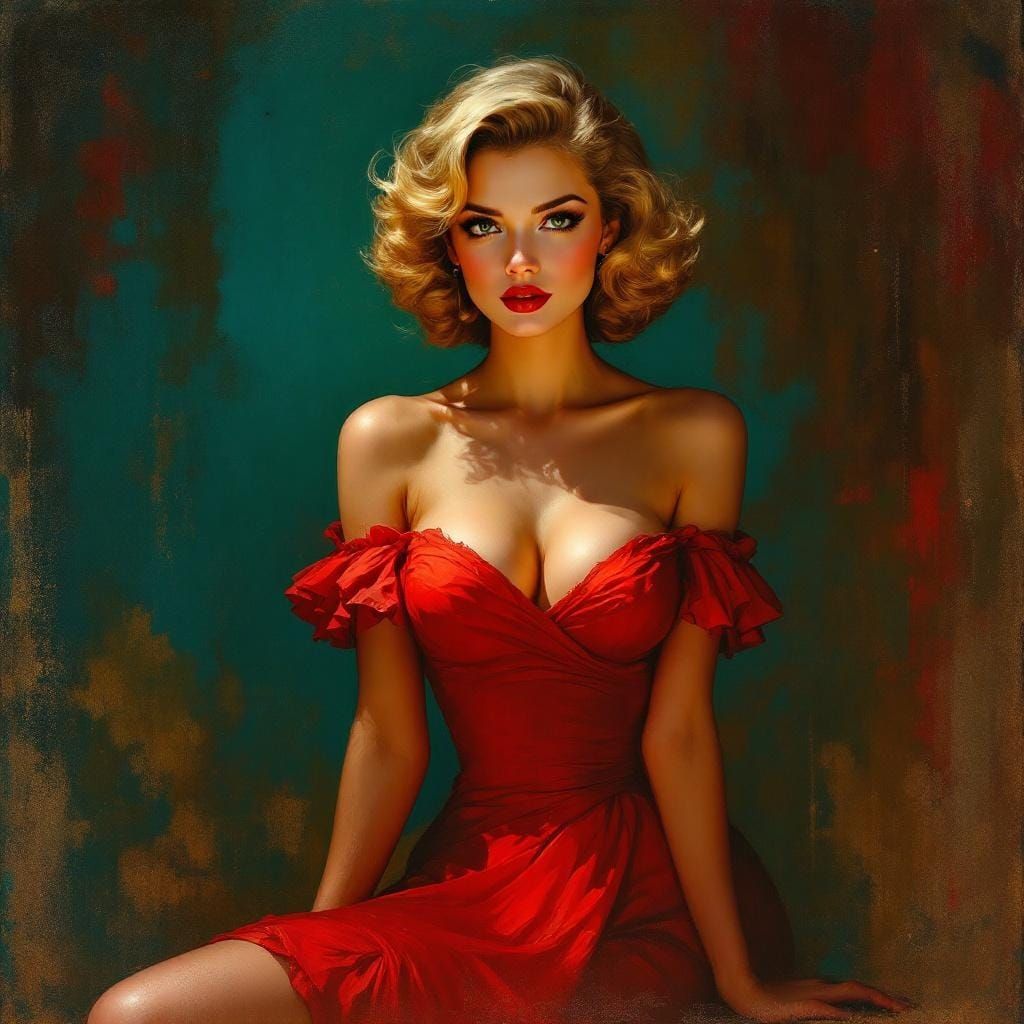 A vibrant painting of a 1950s pin-up woman in a red dress. The artwork blends realism and idealization with painterly brushstrokes, warm golden tones, and impressionistic backgrounds, in an evocative style.