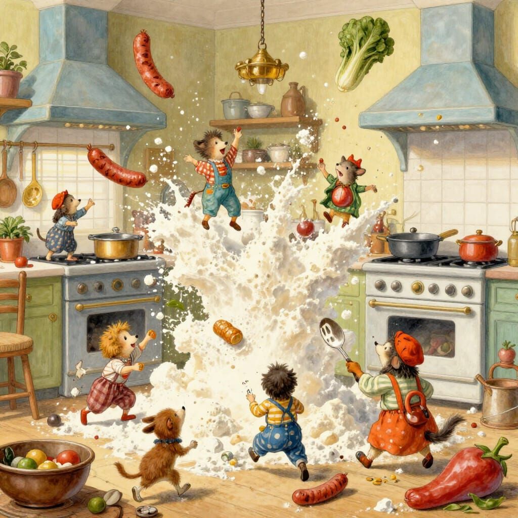This image shows tiny animals gleefully causing chaos in a kitchen with floating flour and airborne food. Captured in a vibrant storybook illustration style with dynamic lighting.