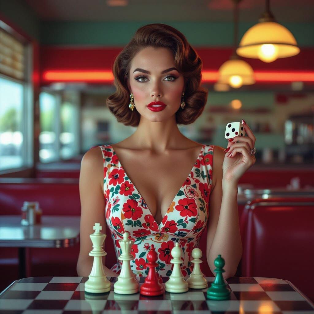 A stylish woman in a 1950s dress holds oversized game pieces in a retro diner. The image features dramatic lighting and bold lines, reminiscent of vintage fashion photography.