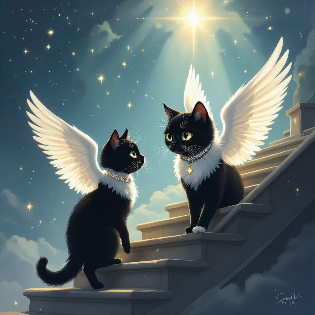 A poignant image of a black cat with angel wings ascending a celestial staircase. She looks back with sorrowful eyes, depicted in a whimsical, illustrative style.