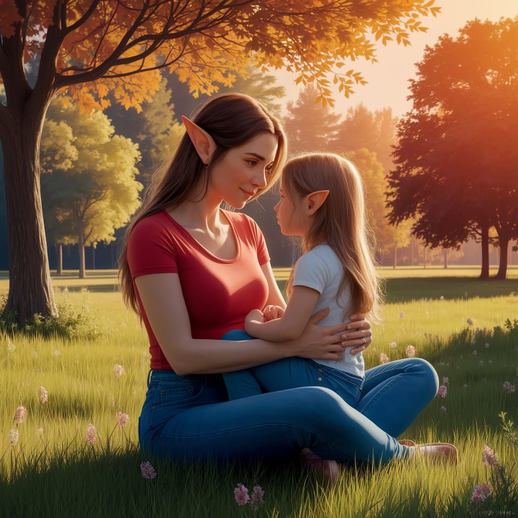 A peaceful image showing an elven mother and daughter enjoying time together in a park. The scene is bathed in golden light with hyperdetailed rendering and a magical realism aesthetic.
