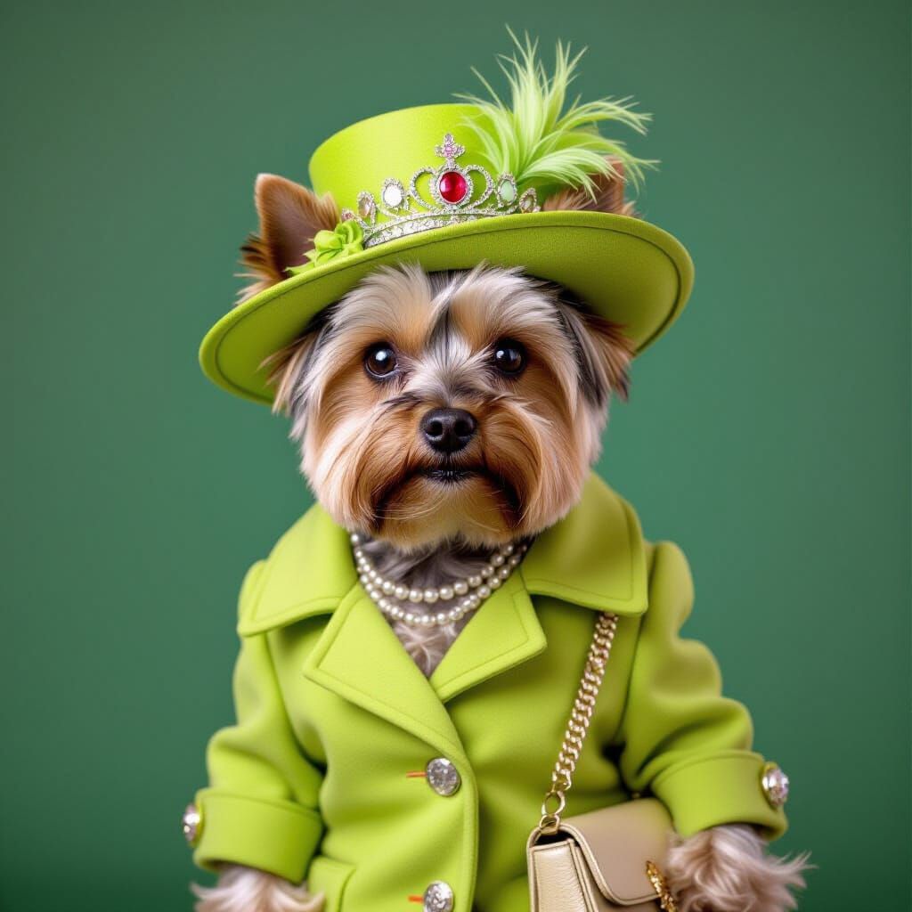 This image features a charming Yorkshire terrier dressed regally as Queen Elizabeth, complete with a lime-colored hat and coat, and carrying a stylish purse.