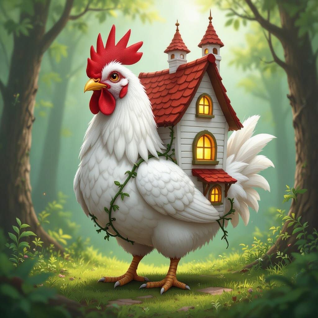 This image showcases a fantastical creature that is a unique blend of a chicken and a house, set in a magical forest. Illustrated in a charming storybook style with vibrant, luminous colors.
