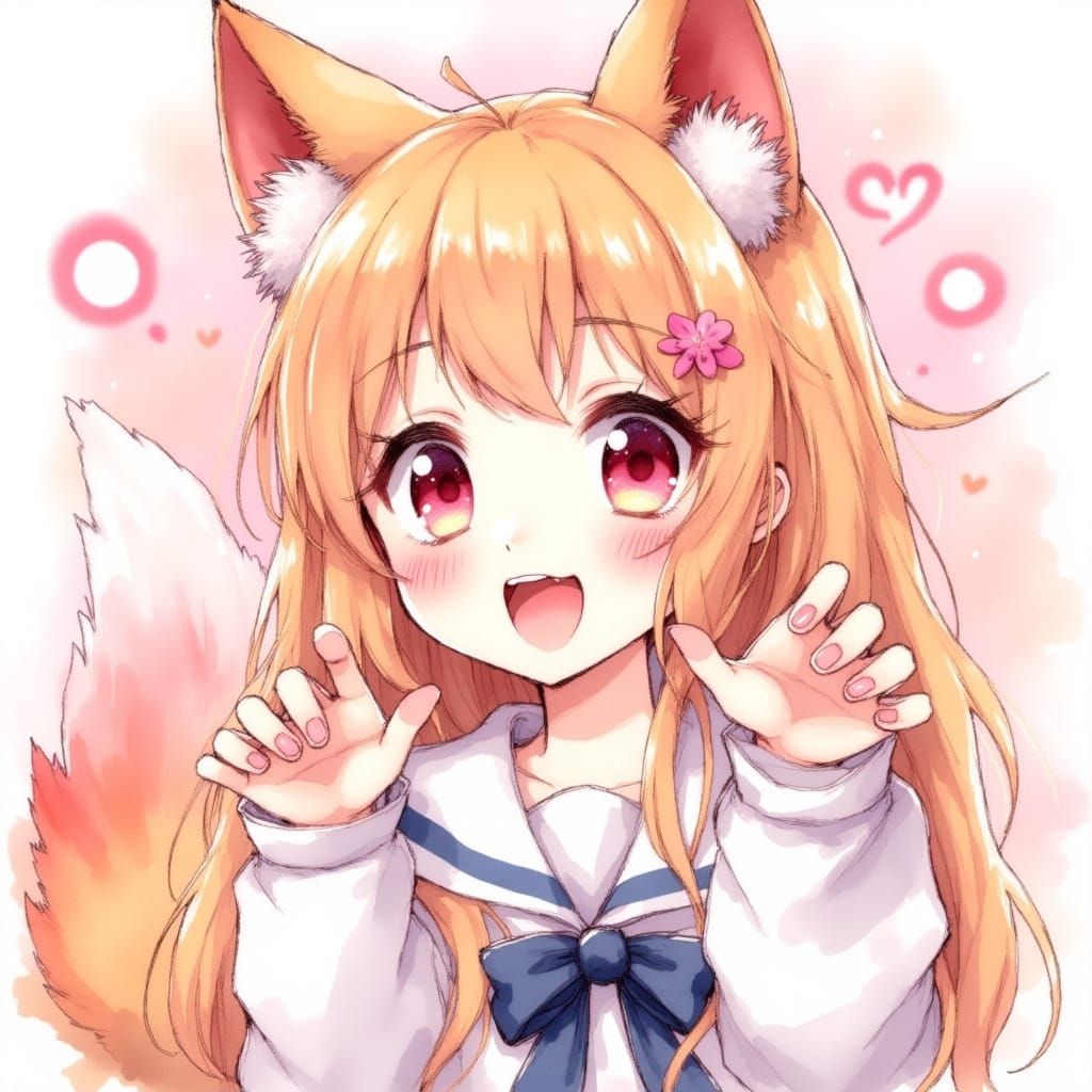 This image shows a cute anime-style fox girl in a school uniform striking a paw pose. The vibrant, pastel-colored artwork features bold lines reminiscent of Japanese Manga.