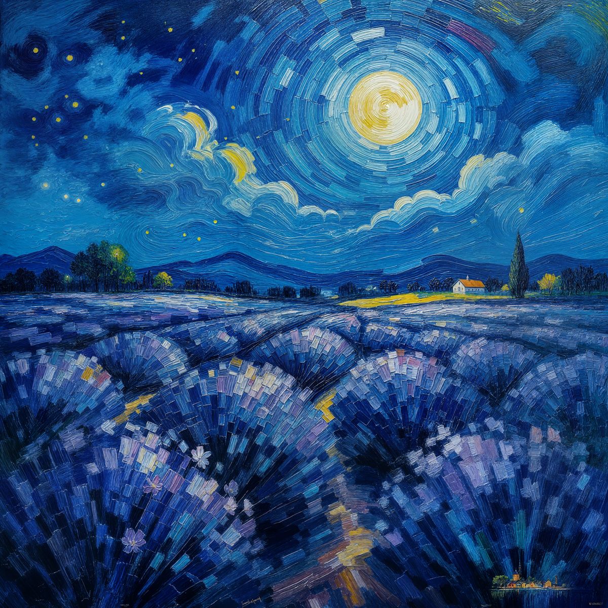 This image depicts an evening landscape of a vibrant purple jasmine field illuminated by numerous fireflies, rendered in a neo-impressionist, expressionist oil painting style with thick, colorful impasto acrylic layers.