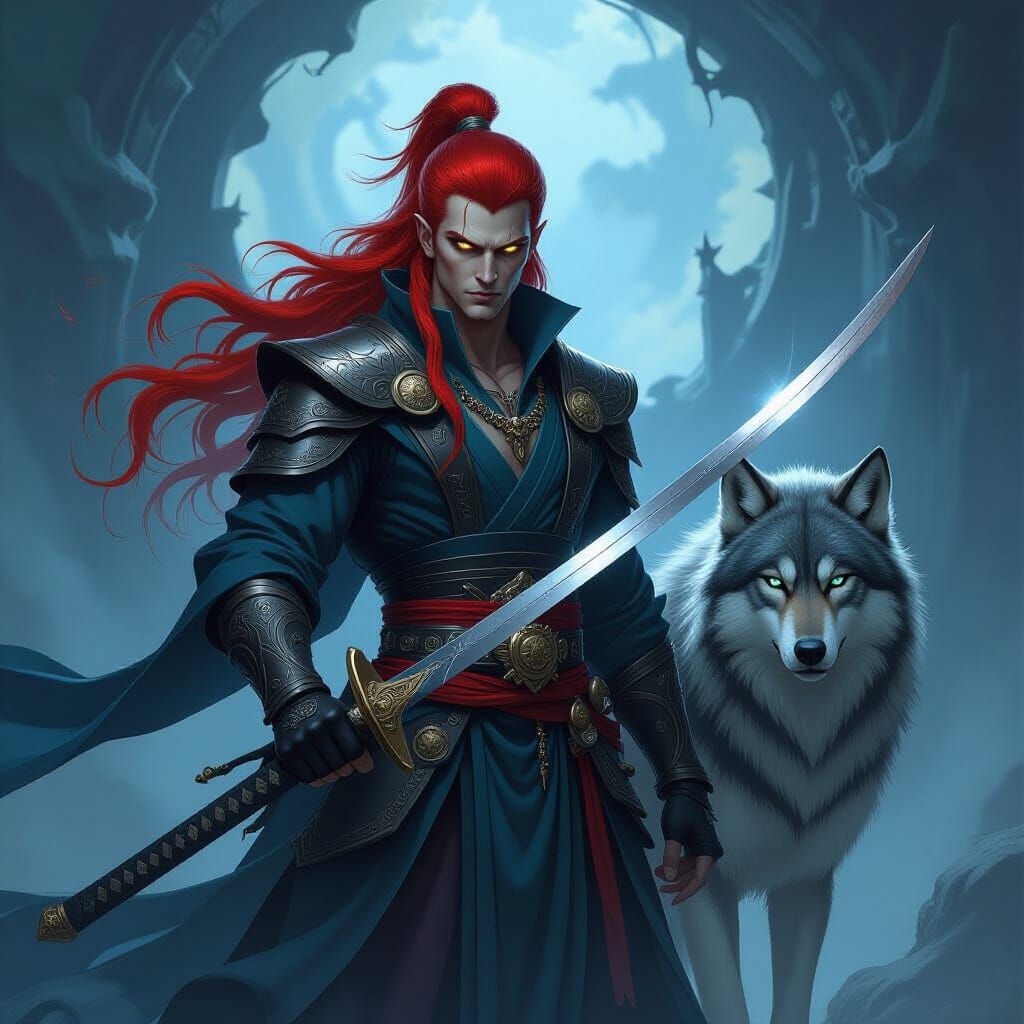 This image depicts Kairos, the Greek god of void and fatherhood, with red hair and blue eyes, holding a katana beside a wolf. Rendered in a dark fantasy art style with dramatic lighting.