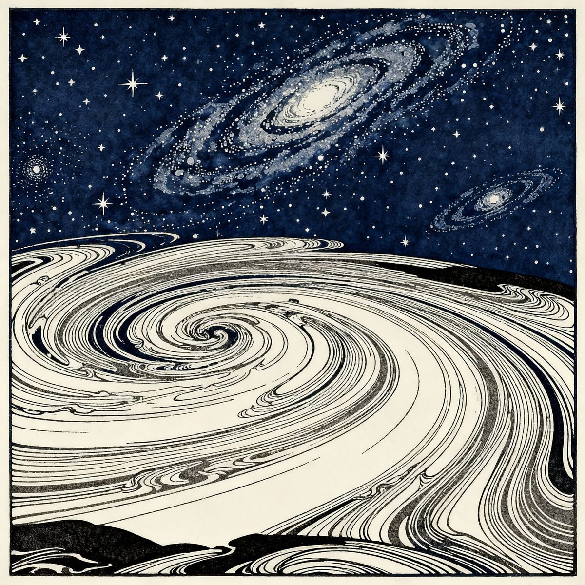 This image features a vast, starry night sky depicted with clean, minimalist lines. Swirling nebulae and galaxies are elegantly drawn, using negative space for cosmic wonder in indigo and charcoal.