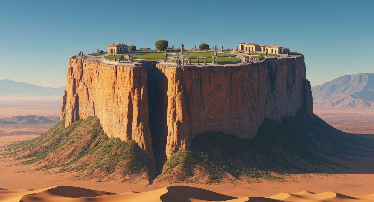 This image shows a flat-topped mountain similar to Mount Roraima, rising from a desert landscape. A large fissure splits the mountain, revealing lush vegetation on its summit.