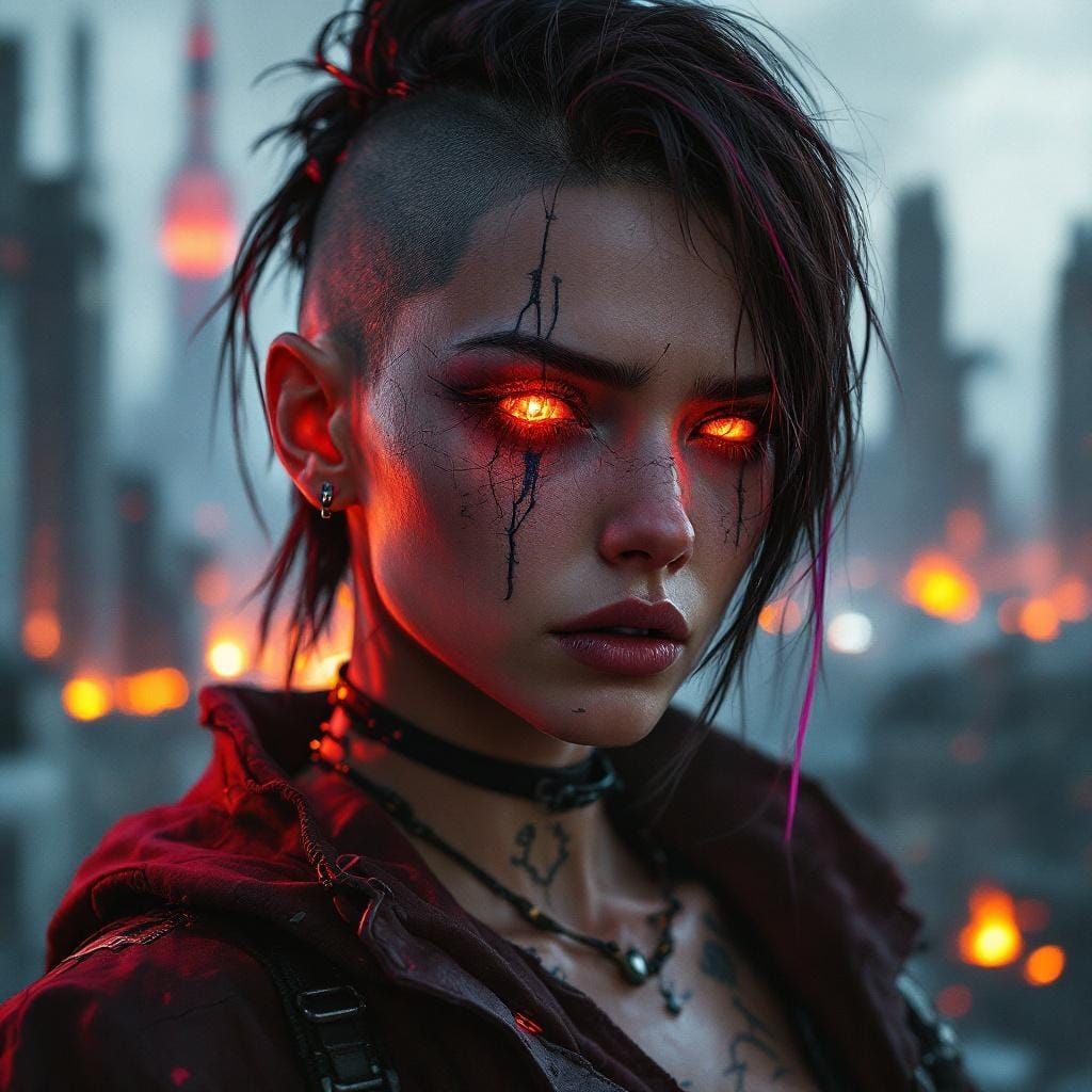 This image shows a cyberpunk drifter with a cybernetic eye and half-shaved neon-threaded hair. The close-up portrait features data tattoos, synthetic skin, and a defiant expression against a blurred, dystopian backdrop.