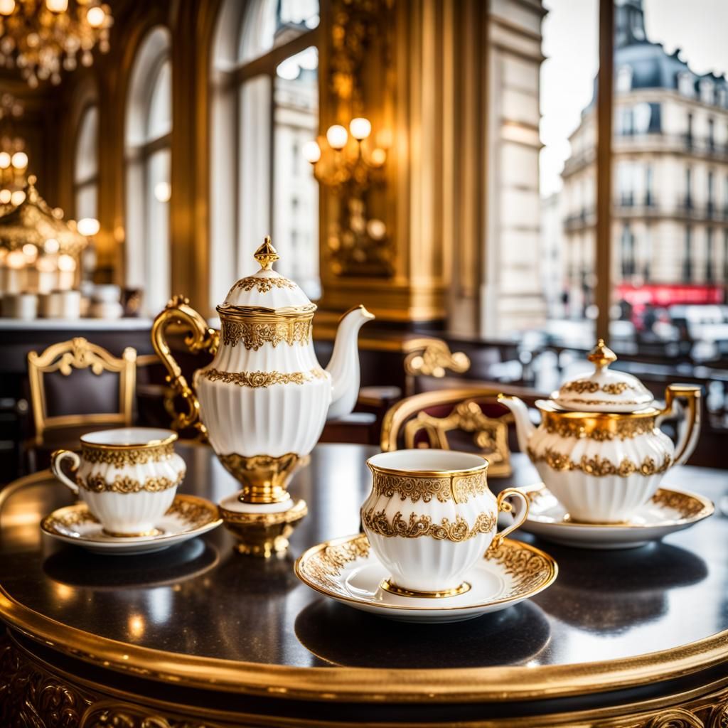 A photograph of a historic Parisian cafe interior. The image features a gold-embellished porcelain coffee set on a table, with a view towards the cafe counter, captured in natural light with a bokeh effect.