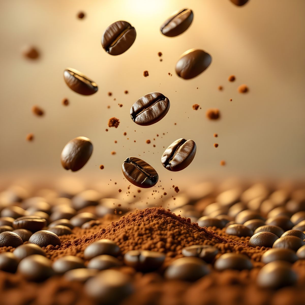 This hyperrealistic image captures roasted coffee beans in slow motion, transforming into fine powder midair with dynamic particle effects and volumetric lighting.