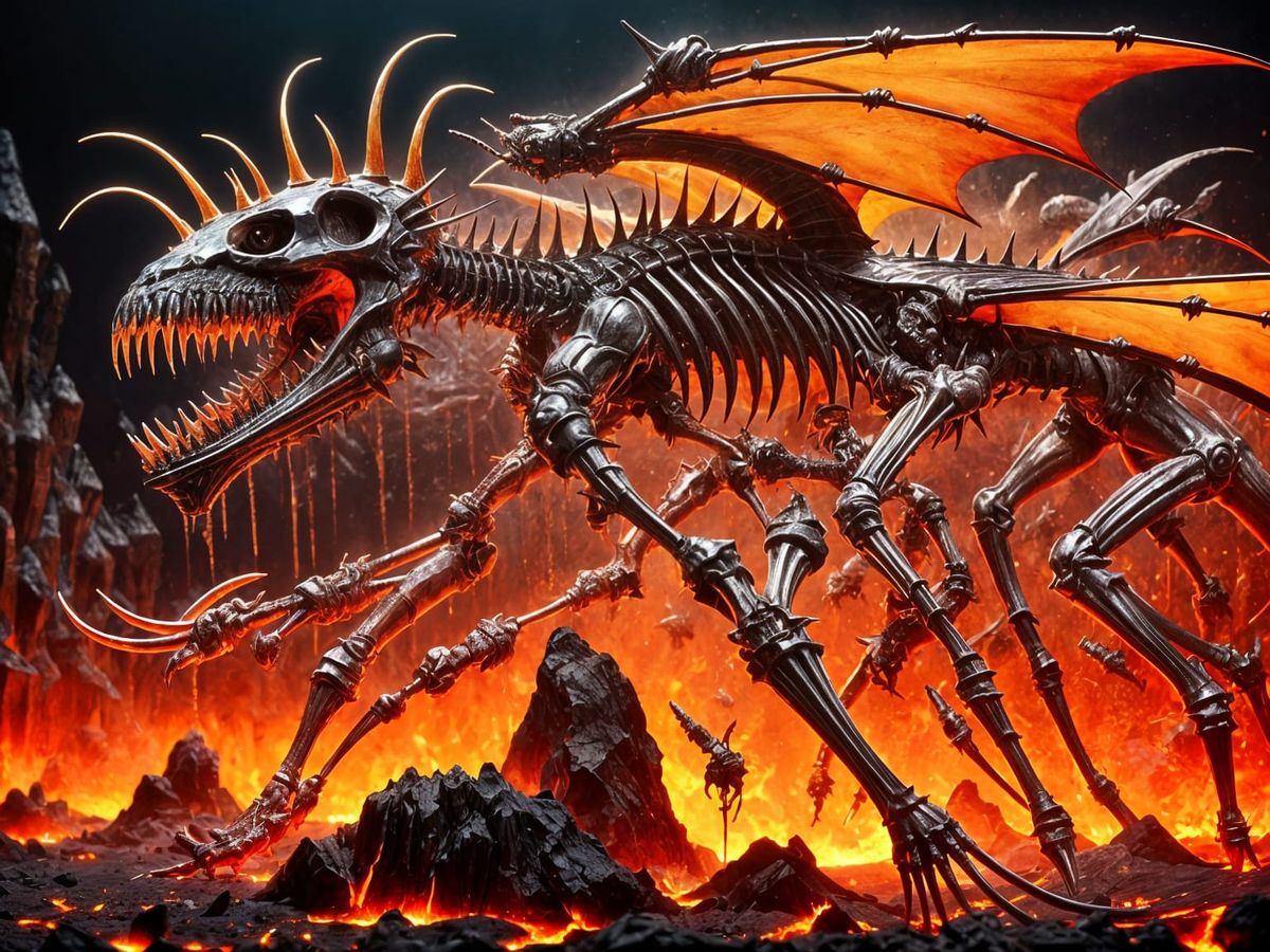 This image features a terrifying skeletal hybrid creature with wolf, centipede, and bat features. It has many legs, wings, sharp teeth, and a body resembling a lava oil slick chrome.