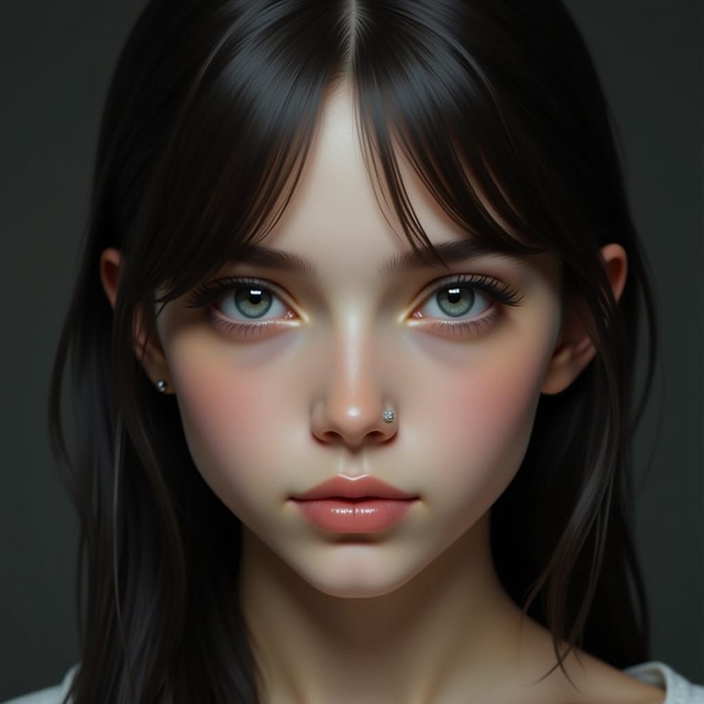 A photorealistic portrait of a teenage girl with intense silver eyes, dark hair, and sharp, chiseled facial features. Captured with cinematic lighting and a shallow depth of field, showcasing hyperdetailed quality.