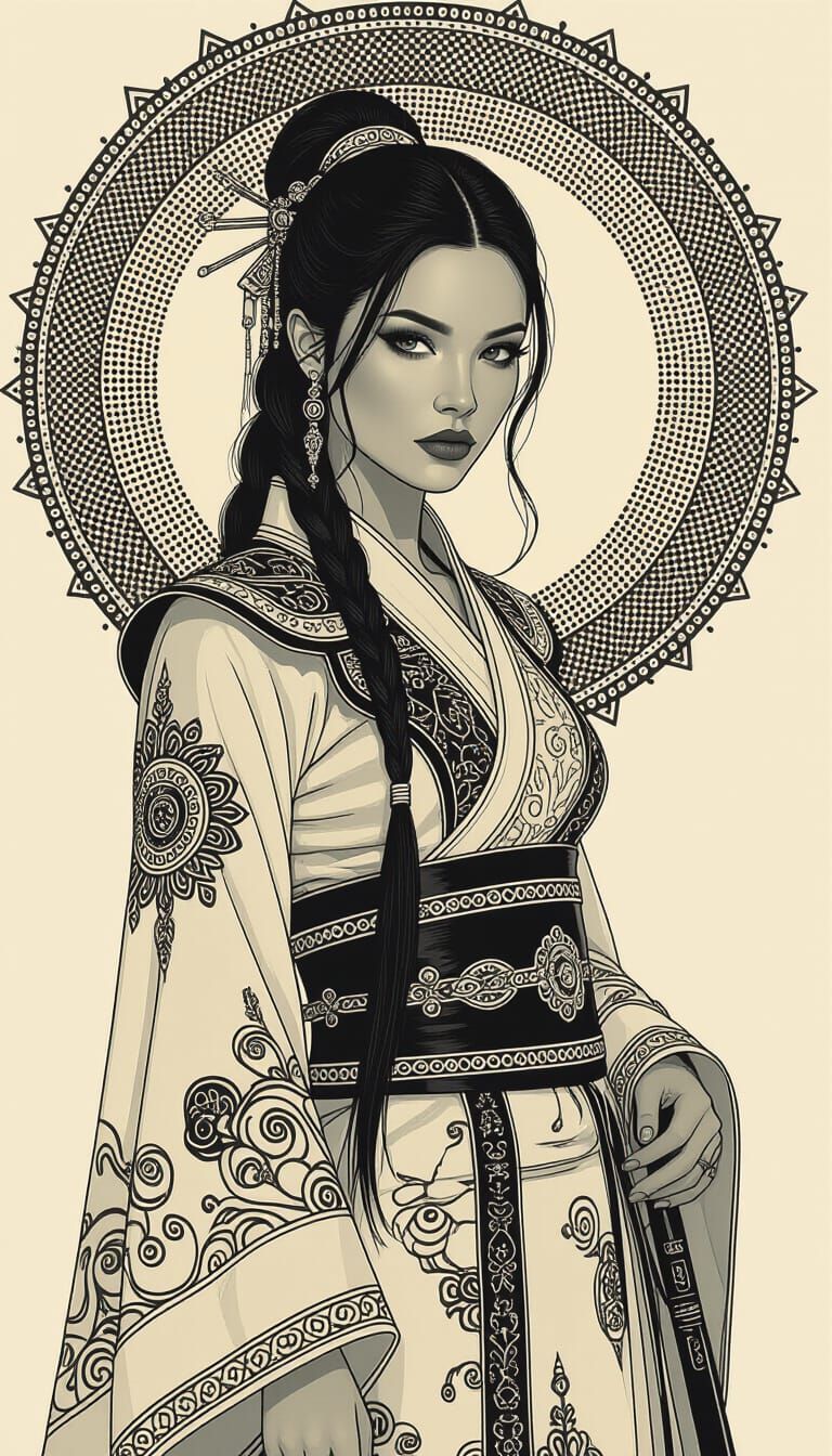 A surreal image of a woman in detailed clothing, surrounded by dotted patterns and fine line art. The aesthetic is reminiscent of cinematic film, with intense lighting and atmospheric effects.