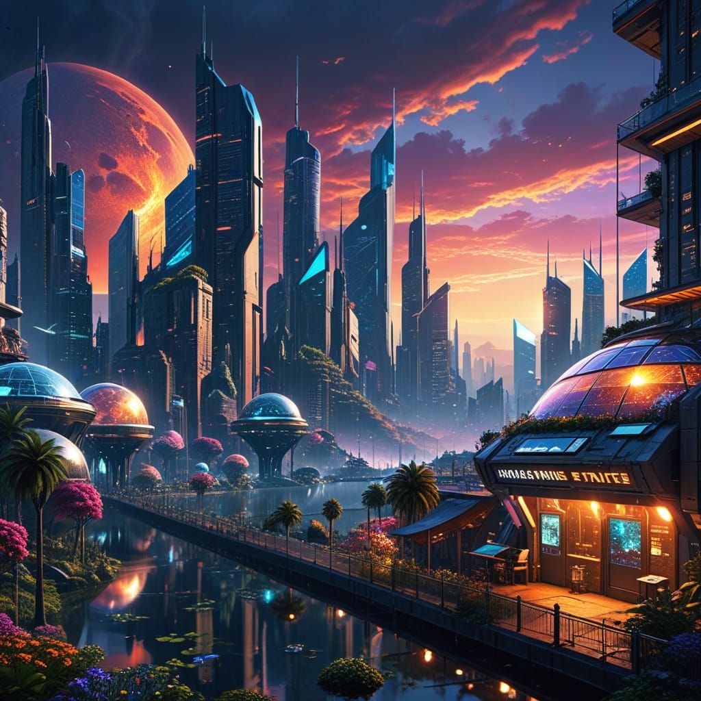 This image depicts a vibrant, fantastical cityscape set in a futuristic utopia, blending science fiction and natural elements in a kaleidoscope of colors and metallic tones.