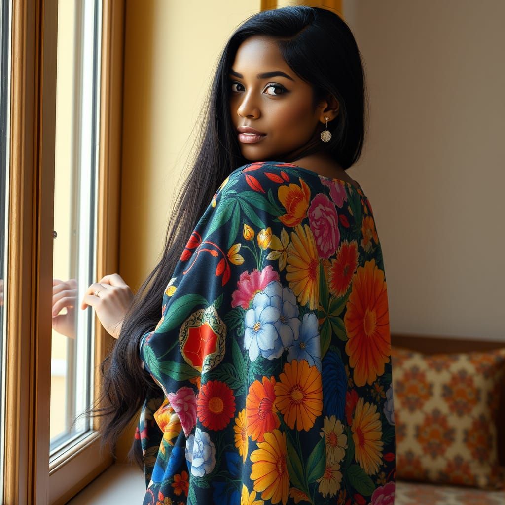 This image shows a woman with long dark hair and brown skin looking over her shoulder near a window. She is wearing a colorful tunic in an art nouveau style.
