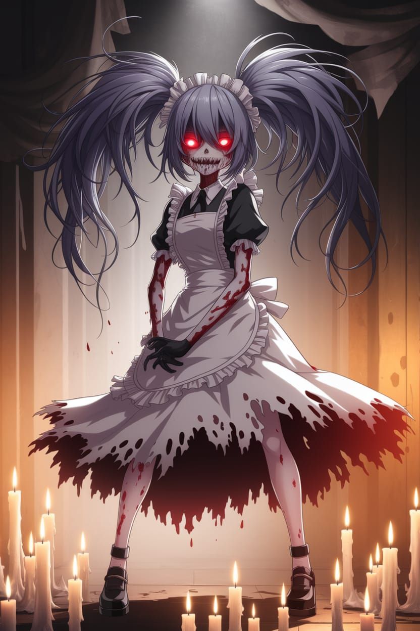 This image depicts a ghostly Grayfia Lucifuge from Highschool DxD in a dimly lit room. Her silver hair is disheveled, her red eyes glow ominously, and her maid outfit is tattered, reflecting her inner corruption.