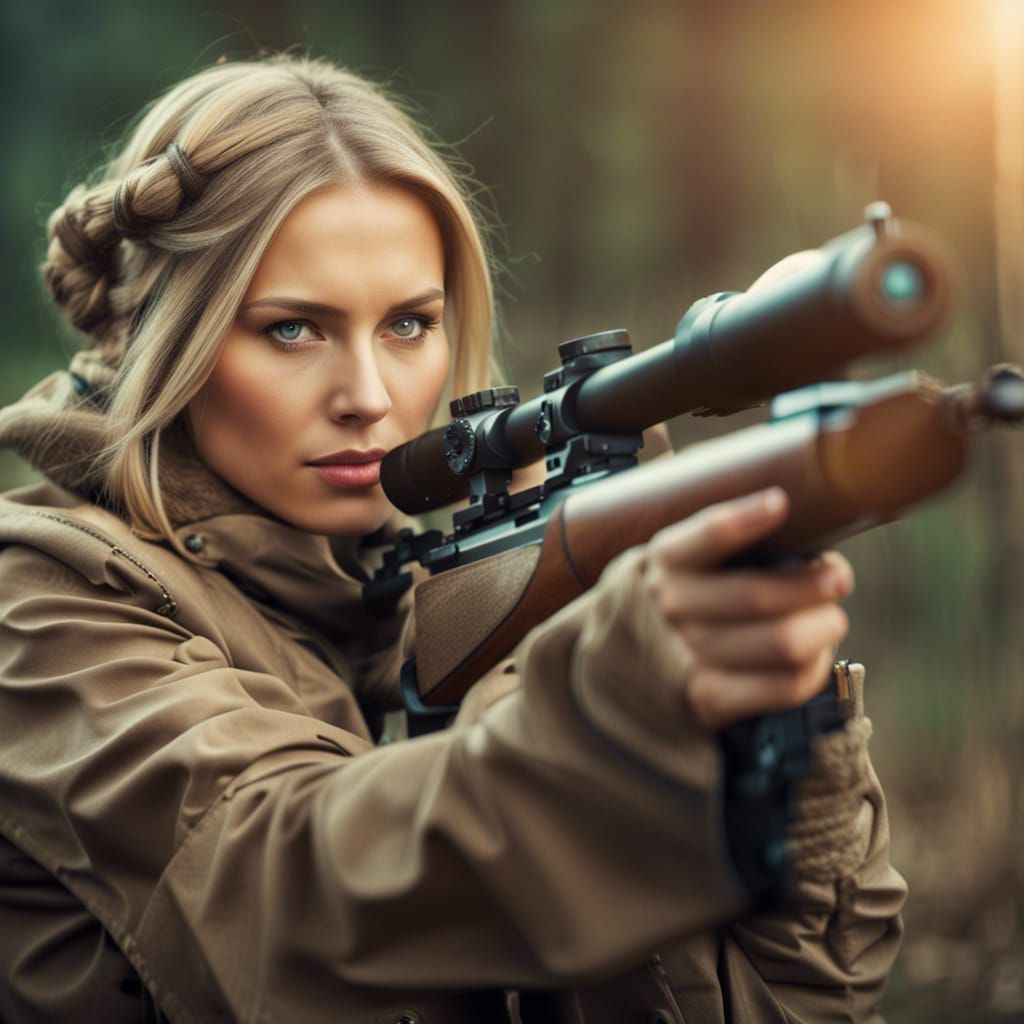 This image shows a stoic Russian woman soldier aiming a rifle, set against a backdrop suggestive of war. The image captures a moment of intense determination.