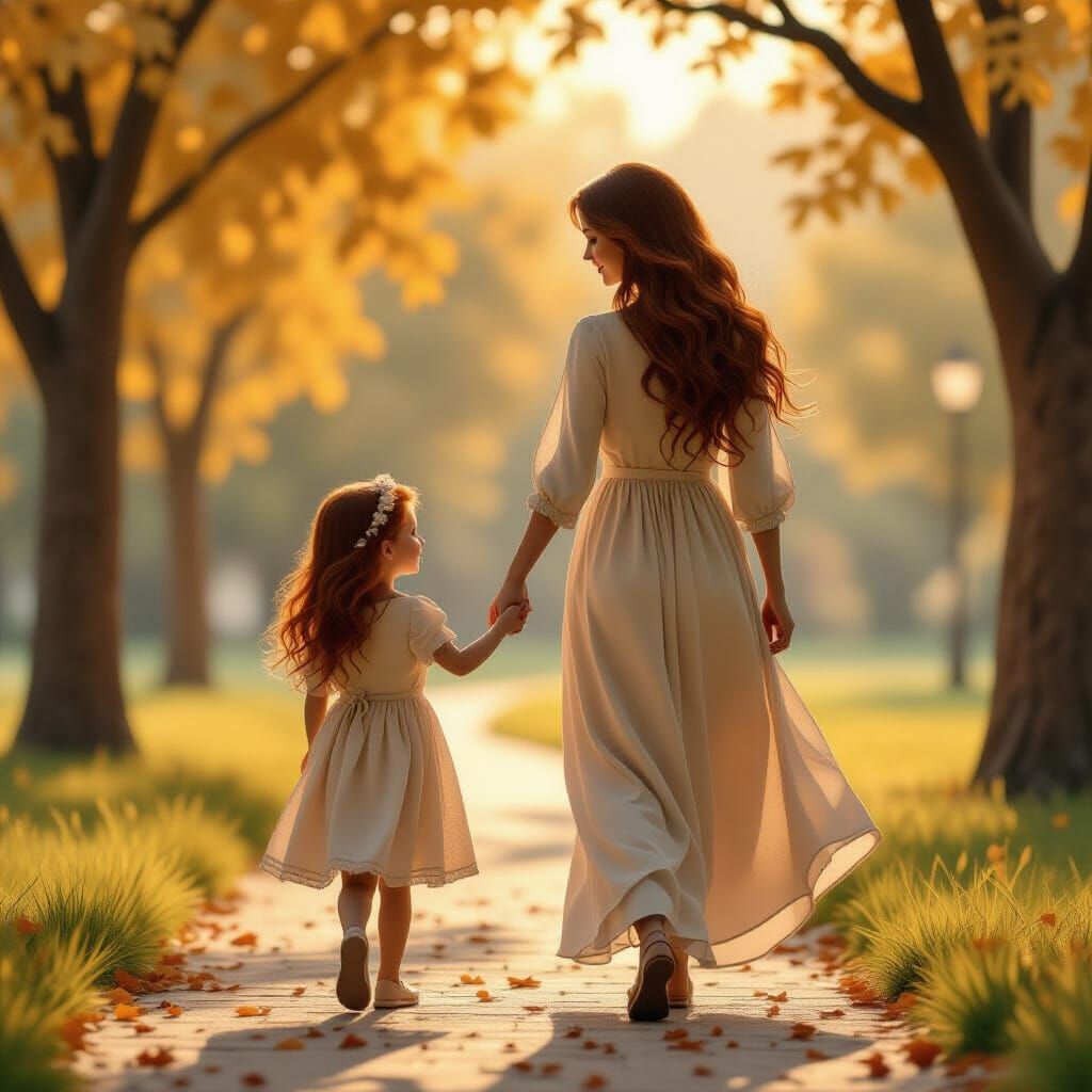 This image shows a mother and daughter walking hand-in-hand through a park. The sculpture is reminiscent of figurative wire art with intricate details and emotive expressiveness, set in warm golden light.