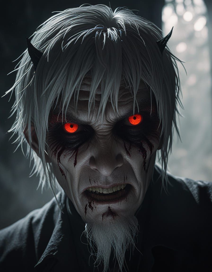 A photorealistic, full body shot of a Kishin Houkou Demonbein in its true form, set in a dark realm. This cinematic horror image features glowing red eyes and detailed white hair with ominous shadows.